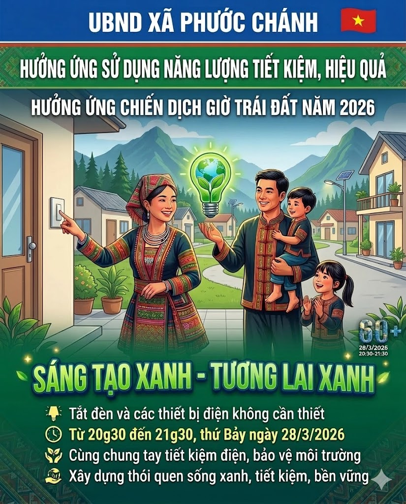 Nhằm nâng cao nhận thức, trách nhiệm của cán bộ, đảng viên và Nhân dân trong việc sử dụng năng lượng tiết kiệm, hiệu quả, góp phần bảo vệ môi trường và ứng phó với biến đổi khí hậu, UBND xã Phước Chánh tuyên truyền, vận động toàn thể Nhân dân tích cực hưởng ứng phong trào “Toàn dân sử dụng năng lượng tiết kiệm, hiệu quả”Chiến dịch Giờ Trái đất năm 2026 với thông điệp: “Sáng tạo xanh - Tương lai xanh”.