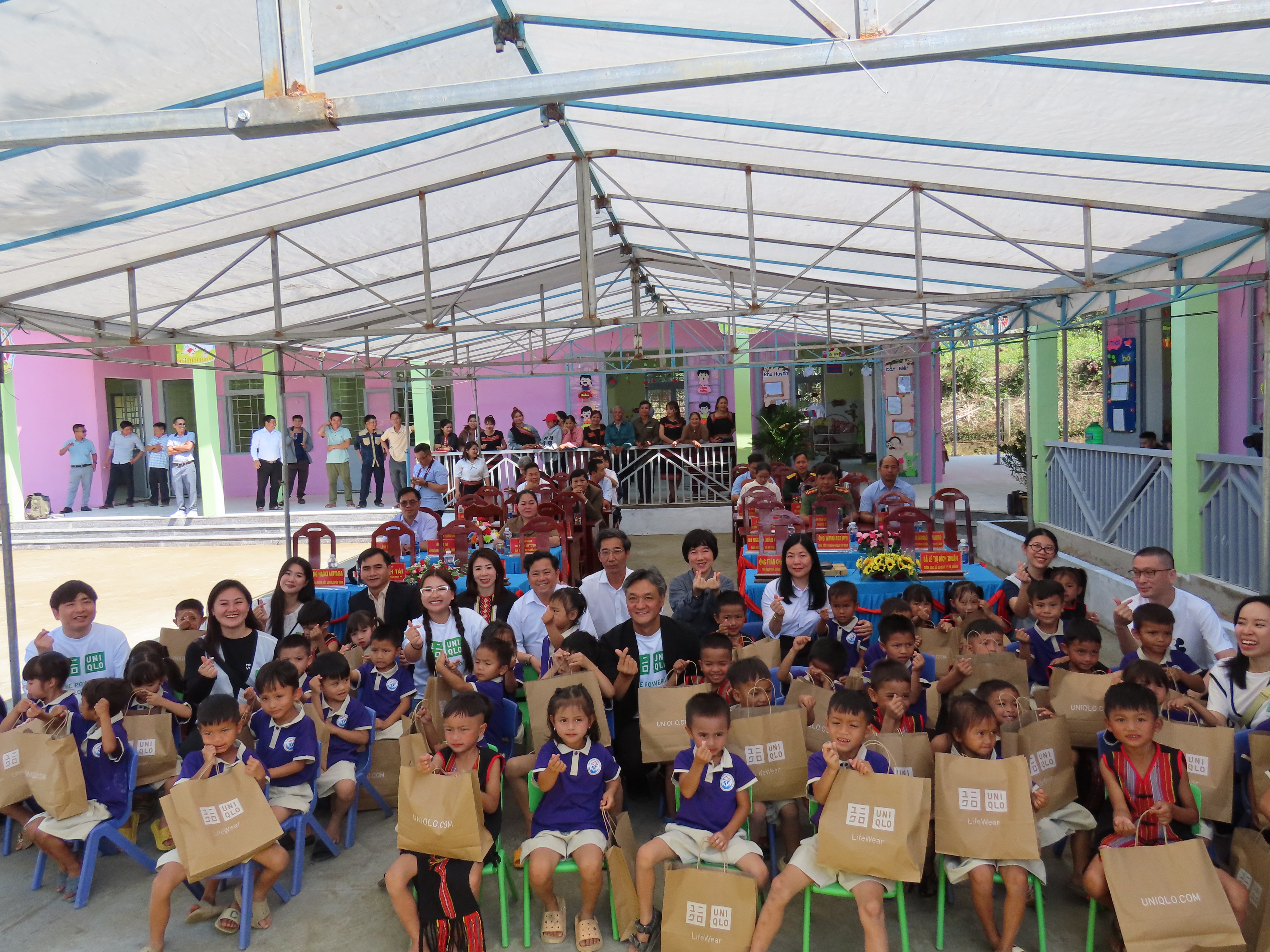 Dịp này, các đơn vị tài trợ trao tặng nhiều phần quà thiết thực như áo, đồ dùng học tập cho học sinh và giáo viên; đồng thời UNIQLO Việt Nam trao 3.000 bộ trang phục cho các hộ gia đình có hoàn cảnh khó khăn.
