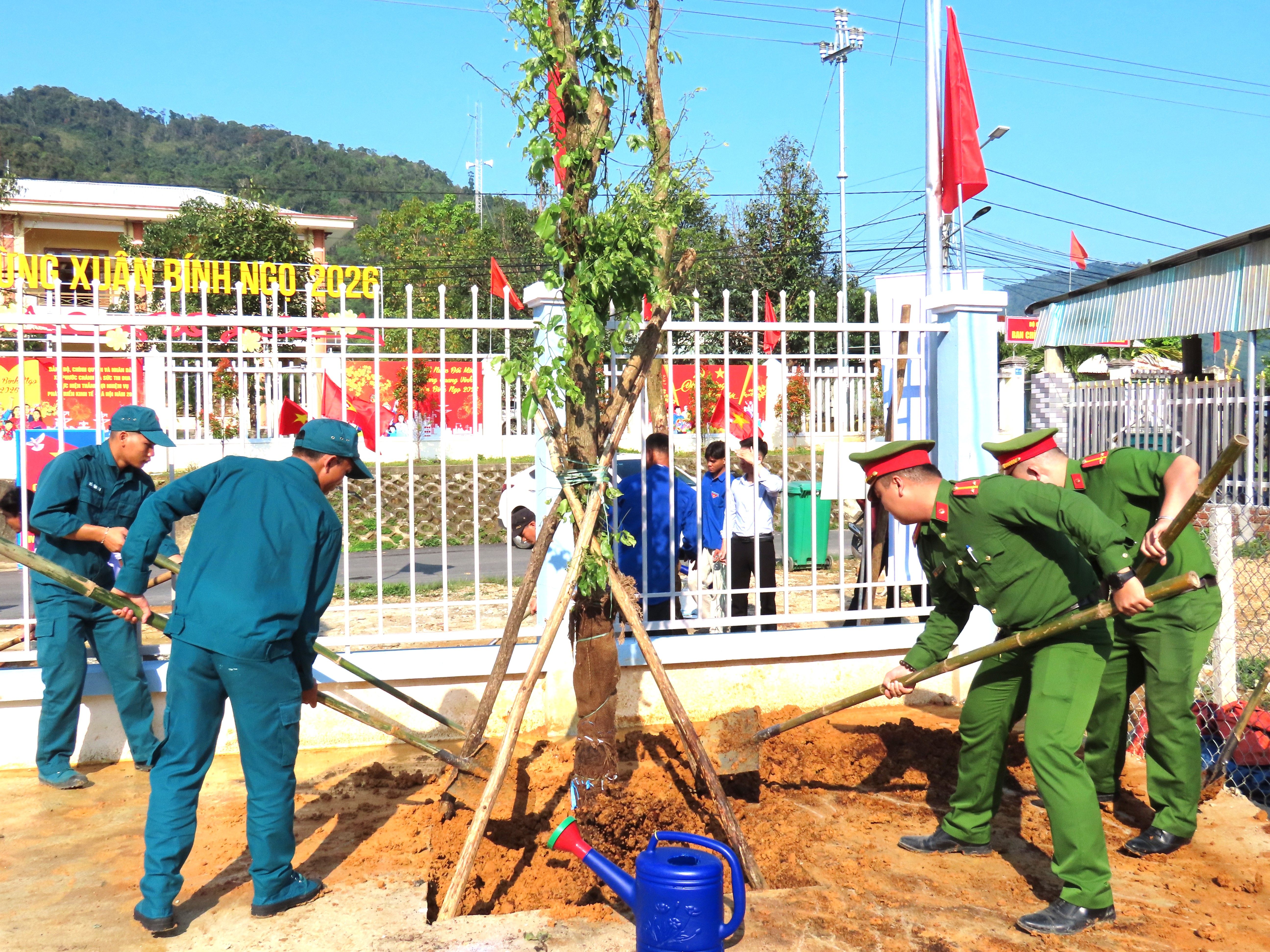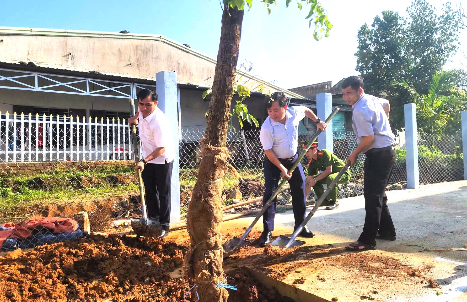 Các lực lượng tham gia trồng và chăm sóc cây tại khu vực trước trụ sở Công an xã.
