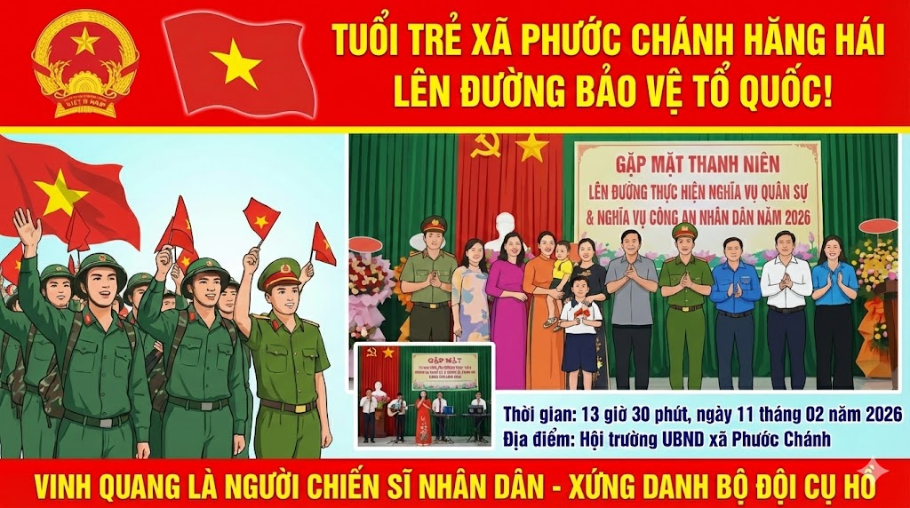 Thực hiện Kế hoạch số 27/KH-UBND ngày 09/02/2026, UBND xã Phước Chánh tổ chức gặp mặt thanh niên lên đường thực hiện nghĩa vụ quân sự và tham gia nghĩa vụ Công an nhân dân năm 2026, nhằm kịp thời động viên tinh thần, phát huy truyền thống yêu nước, trách nhiệm của tuổi trẻ trước nhiệm vụ xây dựng và bảo vệ Tổ quốc.