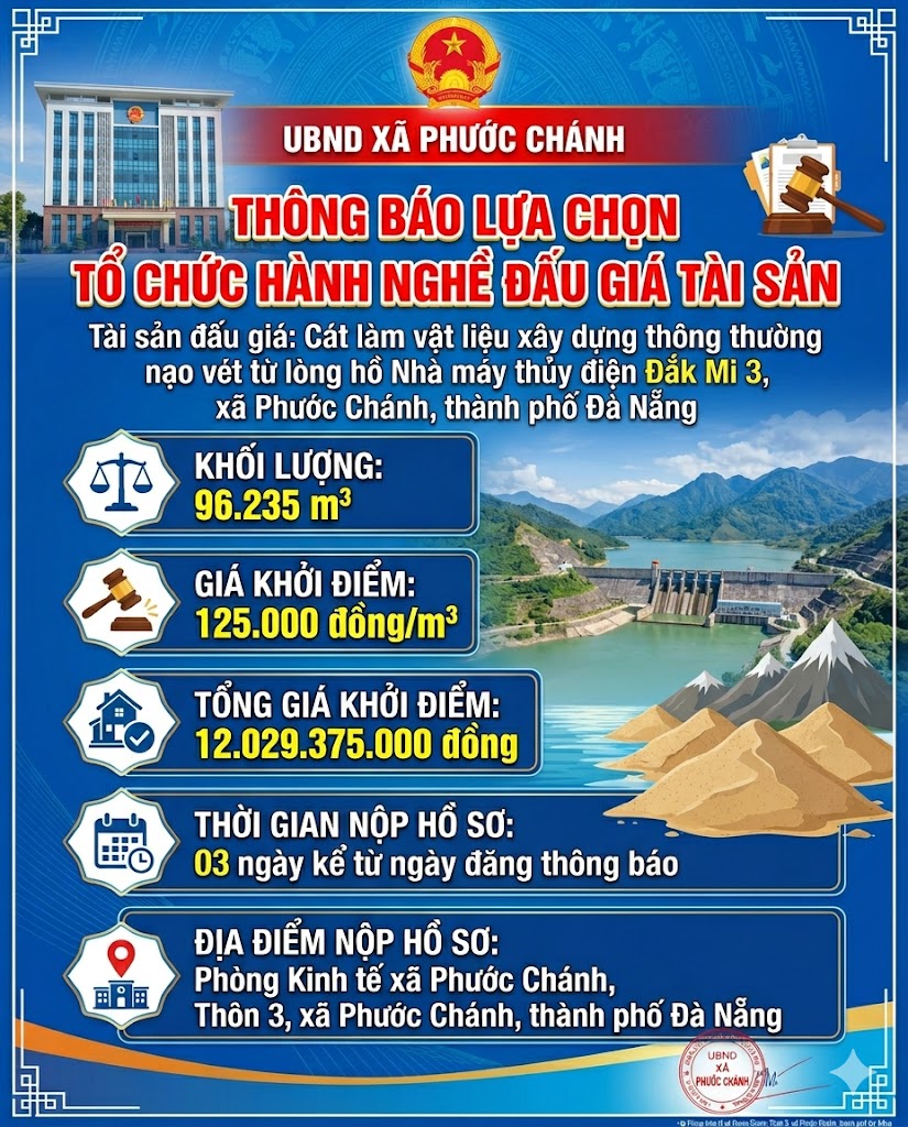 UBND xã Phước Chánh thông tin để các tổ chức hành nghề đấu giá tài sản biết và tham gia đăng ký theo quy định đối với việc lựa chọn đơn vị thực hiện đấu giá tài sản là cát làm vật liệu xây dựng thông thường đã được nạo vét từ lòng hồ Nhà máy thủy điện Đắk Mi 3, xã Phước Chánh, thành phố Đà Nẵng. Nội dung này được nêu rõ trong Thông báo của Phòng Kinh tế xã Phước Chánh.
